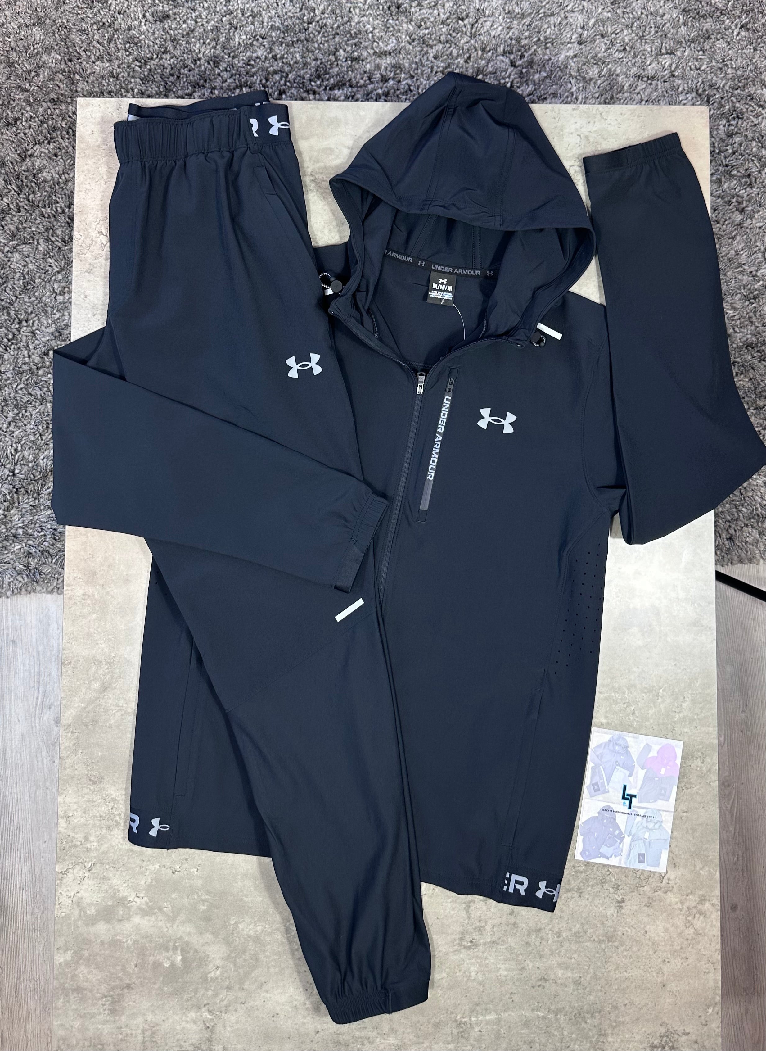 UNDER ARMOUR VANISH TRACKSUIT - BLACK Designed for athletes who demand lightweight performance without compromise, this tracksuit pairs technical innovation with streamlined comfort. The jacket features water-resistant polyester construction that sheds moisture while maintaining breathability, complemented by a full-zip fastening for versatile layering options. An adjustable hood provides customisable coverage against the elements, whilst elasticated trims preserve the garment's shape through intense activity. The matching trackies utilise smooth, lightweight polyester that prioritises freedom of movement and quick-drying properties. Together, these pieces create a cohesive system engineered for training, competition, and everyday athletic pursuits where minimal weight and maximum functionality are non-negotiable.